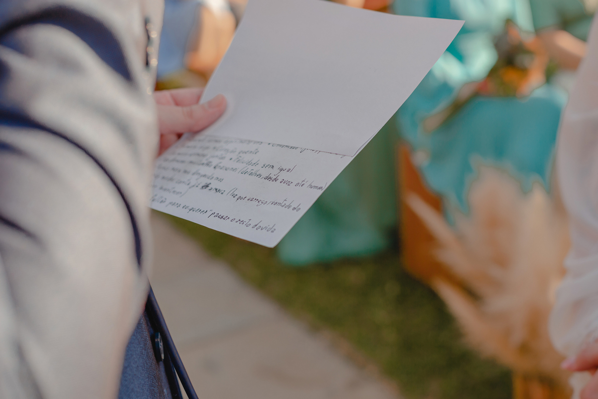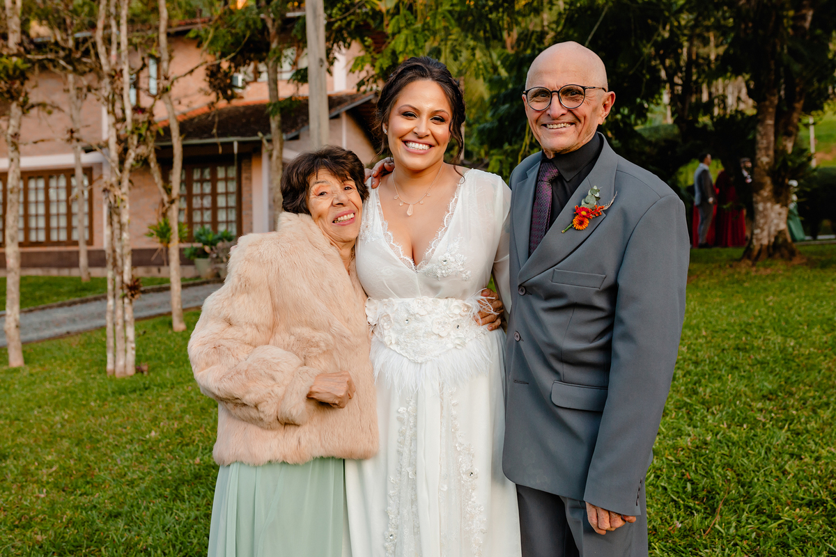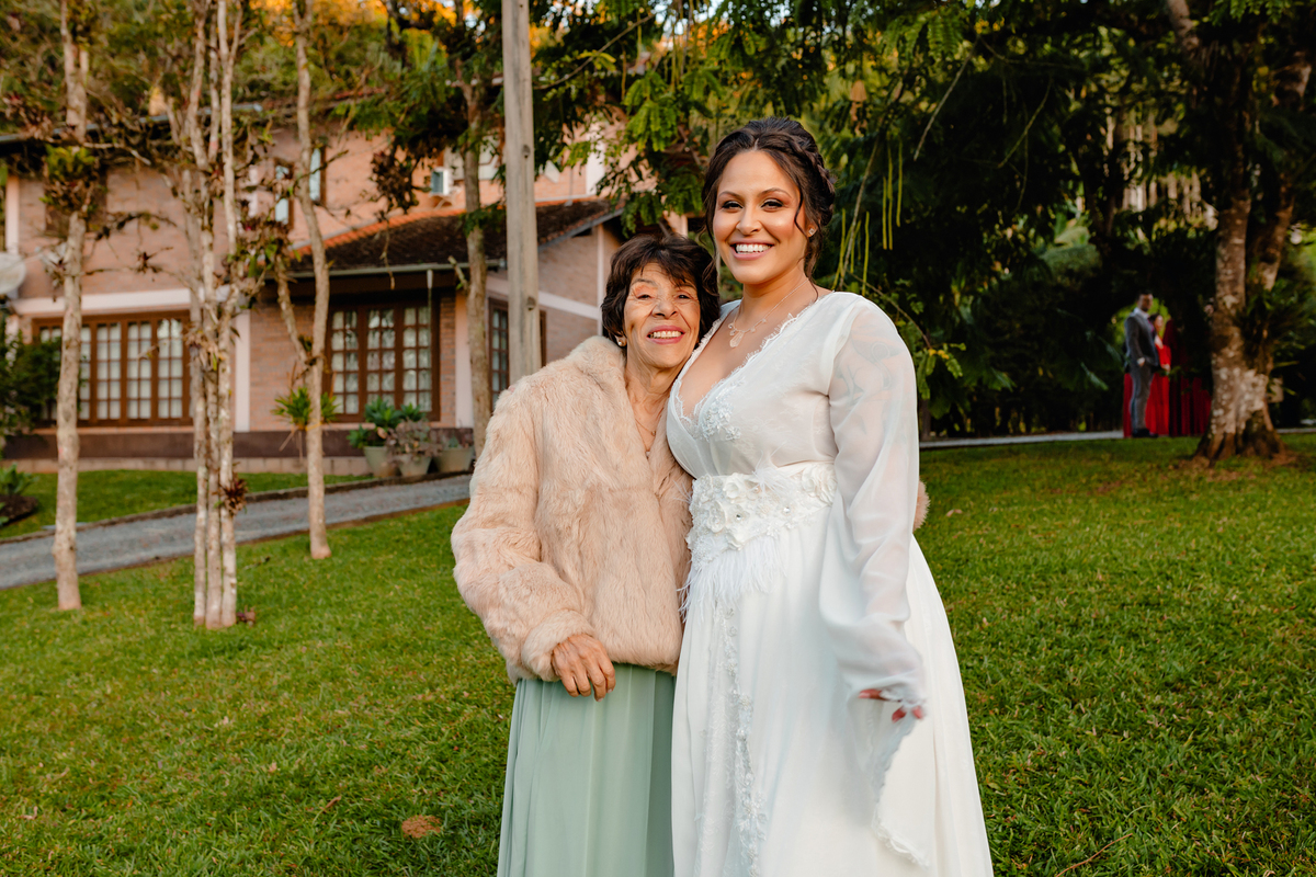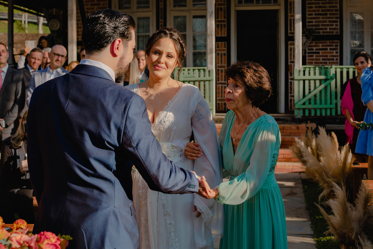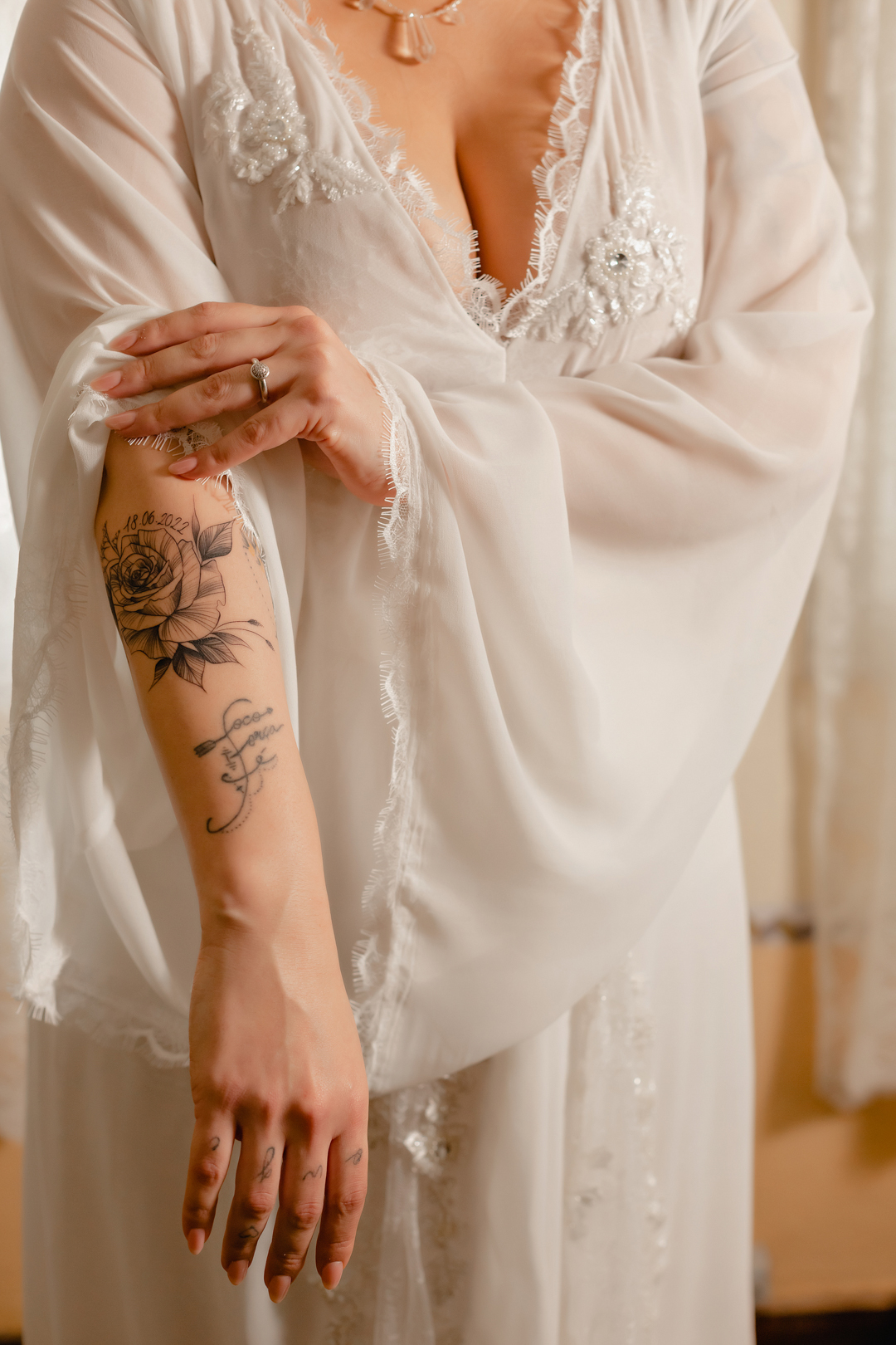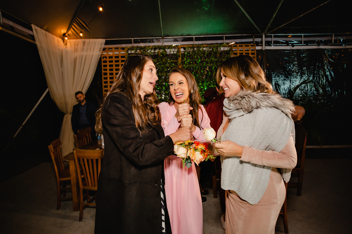 Vamos falar da noiva Gabi, uma alma leve e que contagia a todos com seu sorriso fácil e o brilho nos olhos. Ela fez o seu próprio vestido de noiva, costurou, bordou, ajustou e como ela mesmo falou, a costura não tá muito boa mas é cheio de significado. E não para por aí, a mãe da Gabi já faleceu e no dia do seu casamento a Gabi usou o colar e os brincos que um dia foram dela. E para finalizar, ela nos contou que sempre quis ter o sobrenome Rosa por achar um nome artístico e logo ela conheceu o Gabriel, e seu sobrenome? Rosa. Como uma homenagem e surpresa para o Gabriel, ela tatuou uma rosa com a data do casamento deles e revelou para ele na cerimônia. Lindo, né? Ah, e ainda em vida sua mãe tinha um grupo de amigas, as Lulus e lá estavam elas, como damas de honra.