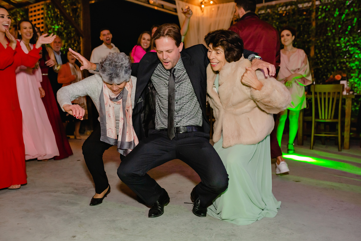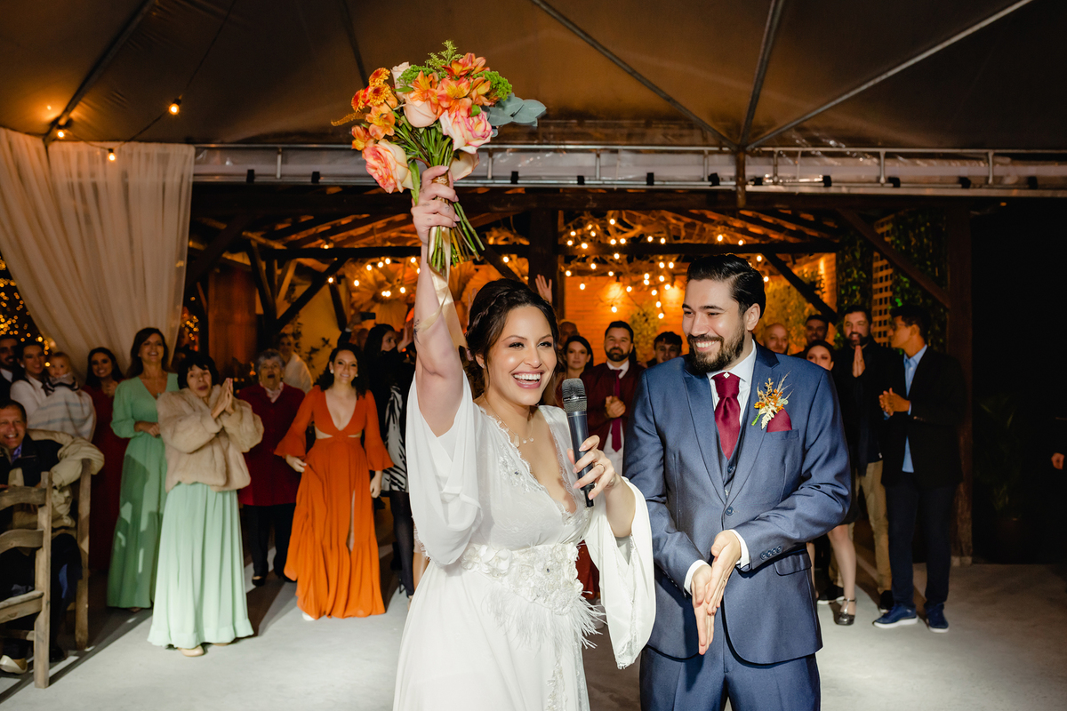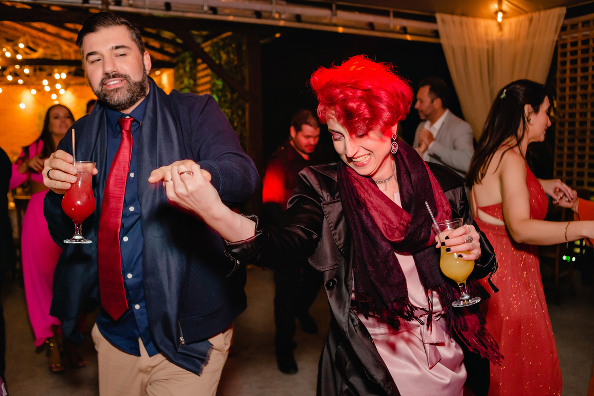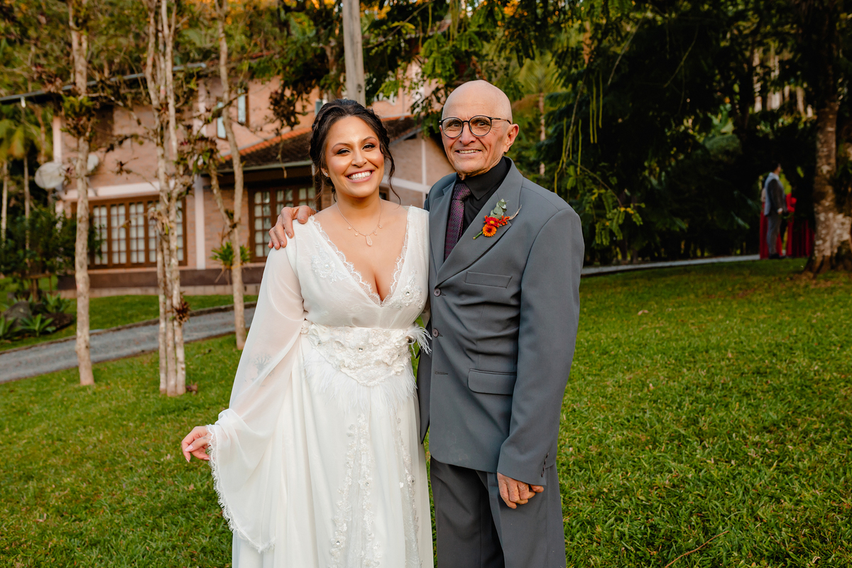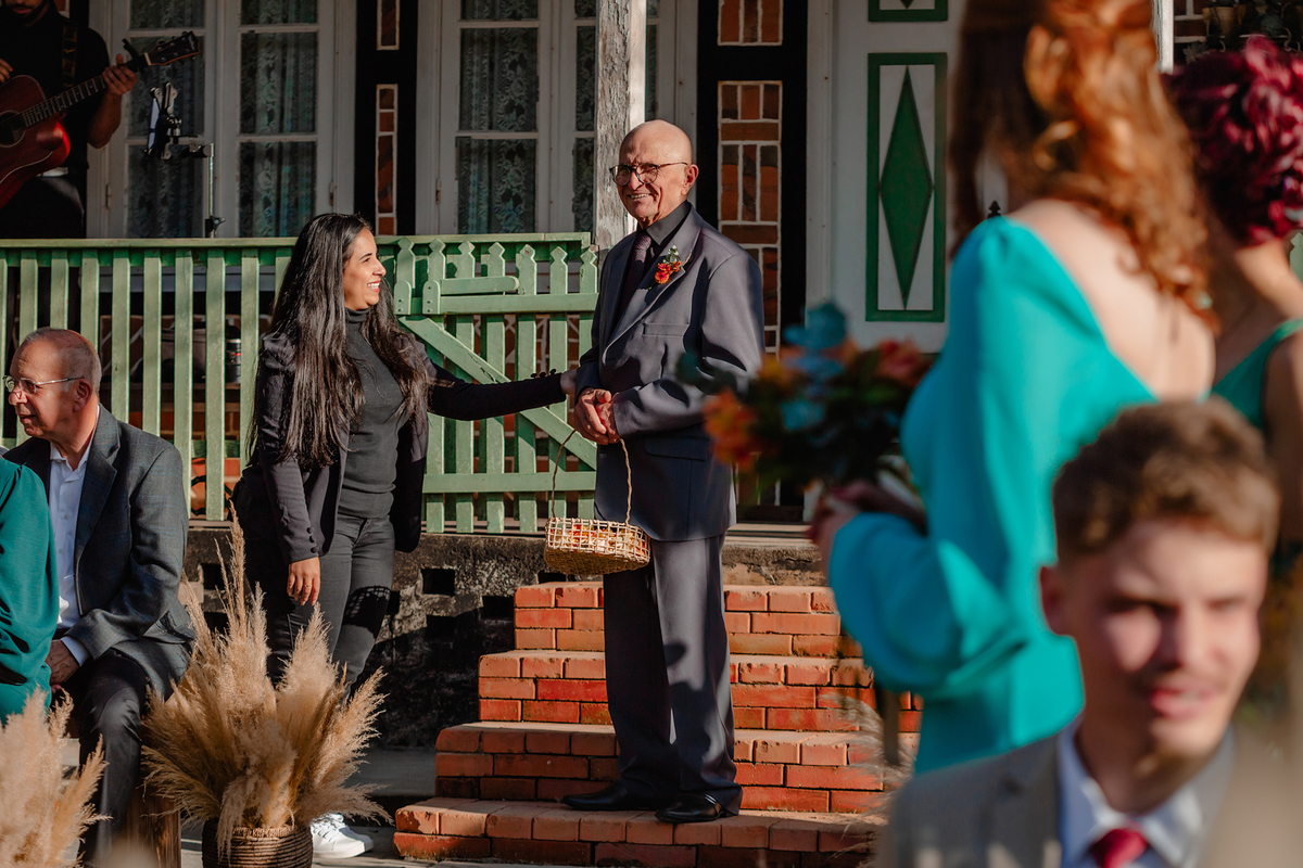 Vamos falar da noiva Gabi, uma alma leve e que contagia a todos com seu sorriso fácil e o brilho nos olhos. Ela fez o seu próprio vestido de noiva, costurou, bordou, ajustou e como ela mesmo falou, a costura não tá muito boa mas é cheio de significado. E não para por aí, a mãe da Gabi já faleceu e no dia do seu casamento a Gabi usou o colar e os brincos que um dia foram dela. E para finalizar, ela nos contou que sempre quis ter o sobrenome Rosa por achar um nome artístico e logo ela conheceu o Gabriel, e seu sobrenome? Rosa. Como uma homenagem e surpresa para o Gabriel, ela tatuou uma rosa com a data do casamento deles e revelou para ele na cerimônia. Lindo, né? Ah, e ainda em vida sua mãe tinha um grupo de amigas, as Lulus e lá estavam elas, como damas de honra.