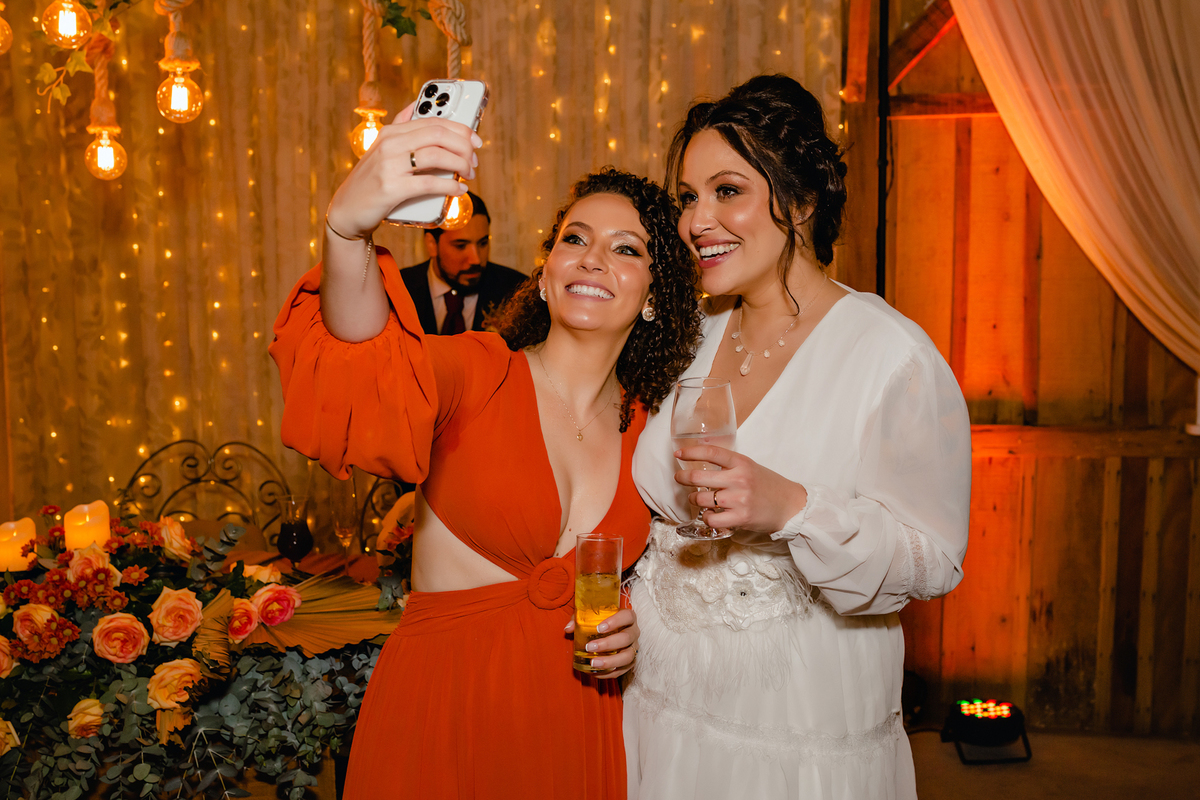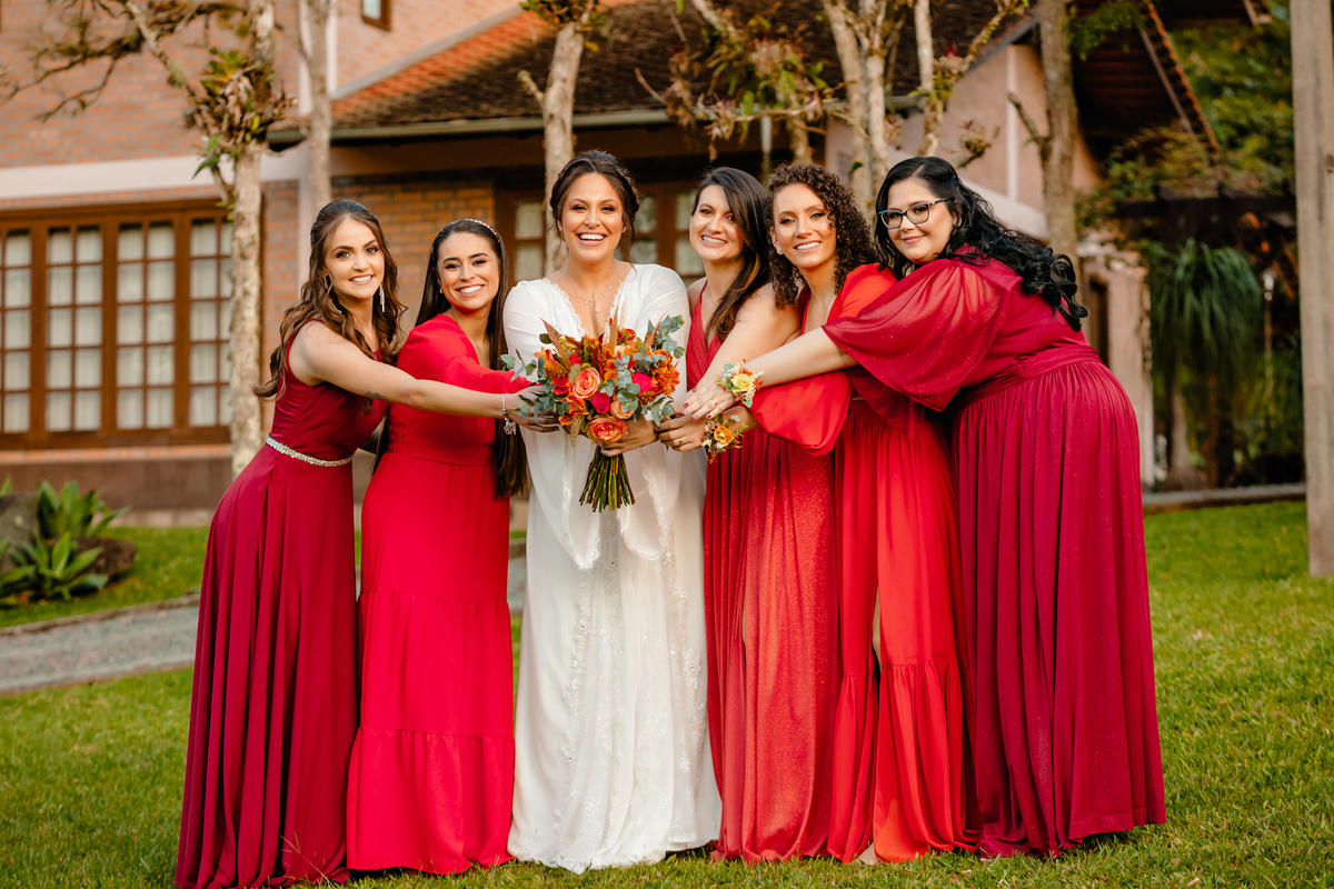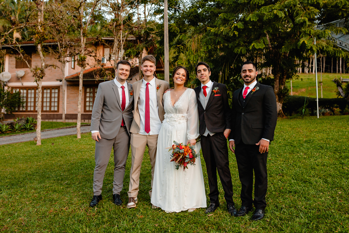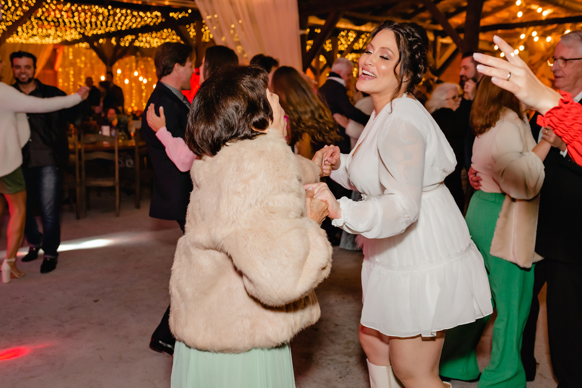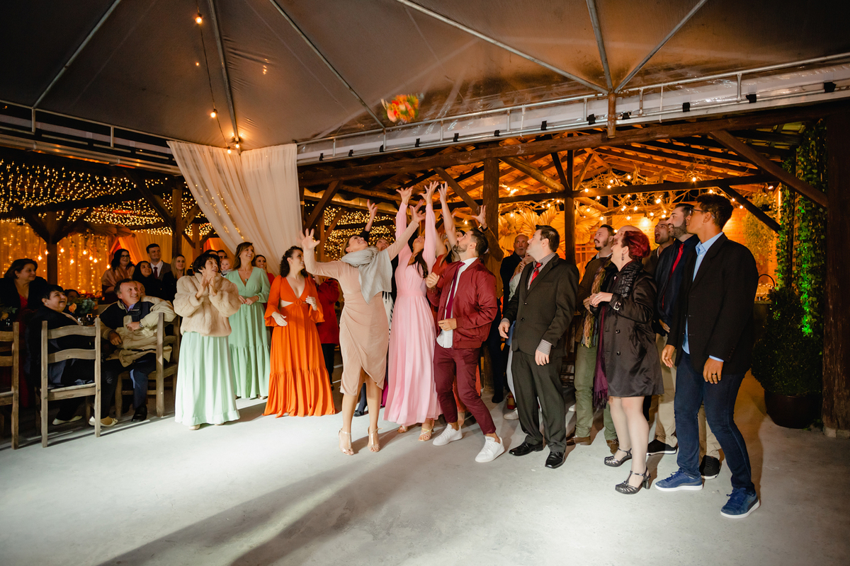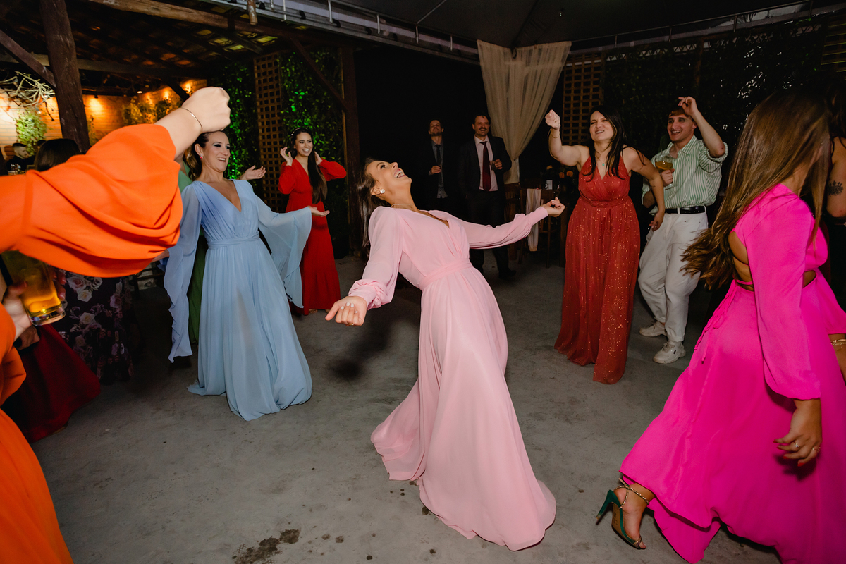 Vamos falar da noiva Gabi, uma alma leve e que contagia a todos com seu sorriso fácil e o brilho nos olhos. Ela fez o seu próprio vestido de noiva, costurou, bordou, ajustou e como ela mesmo falou, a costura não tá muito boa mas é cheio de significado. E não para por aí, a mãe da Gabi já faleceu e no dia do seu casamento a Gabi usou o colar e os brincos que um dia foram dela. E para finalizar, ela nos contou que sempre quis ter o sobrenome Rosa por achar um nome artístico e logo ela conheceu o Gabriel, e seu sobrenome? Rosa. Como uma homenagem e surpresa para o Gabriel, ela tatuou uma rosa com a data do casamento deles e revelou para ele na cerimônia. Lindo, né? Ah, e ainda em vida sua mãe tinha um grupo de amigas, as Lulus e lá estavam elas, como damas de honra.