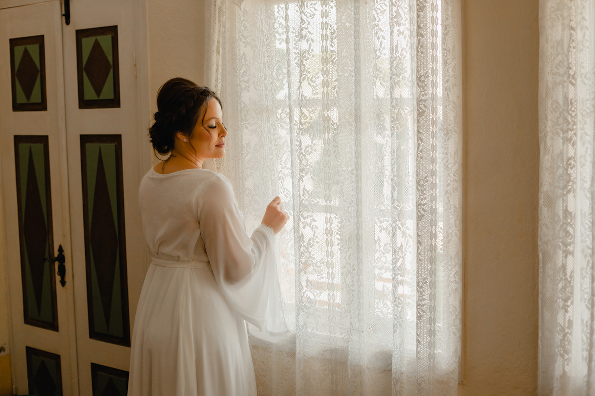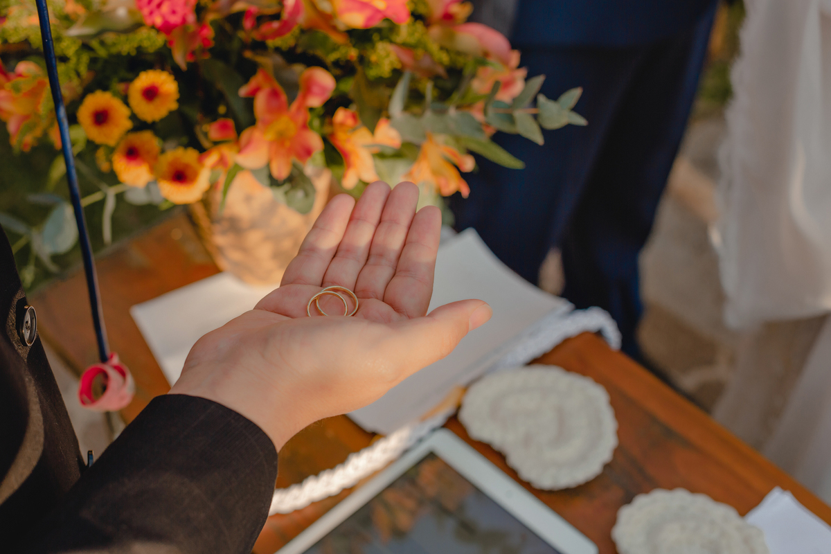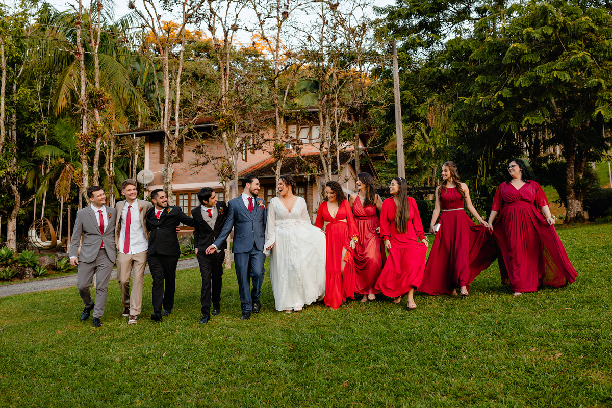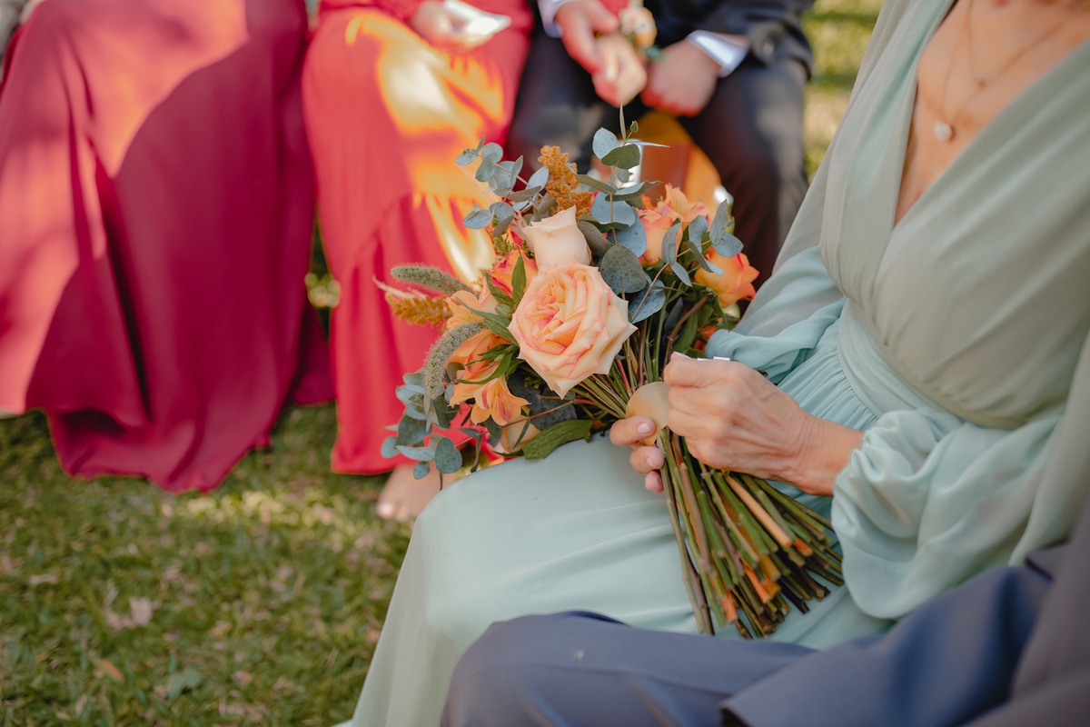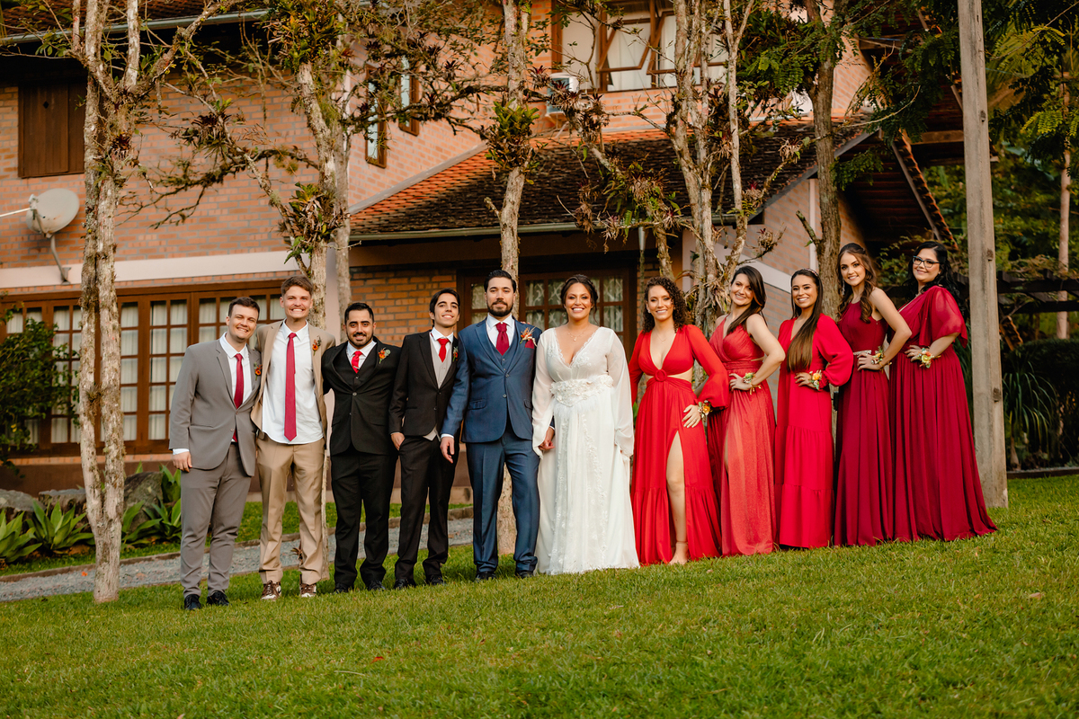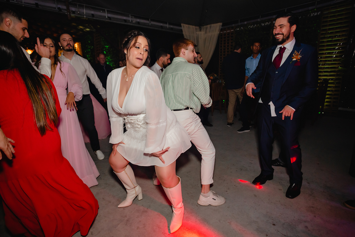 Vamos falar da noiva Gabi, uma alma leve e que contagia a todos com seu sorriso fácil e o brilho nos olhos. Ela fez o seu próprio vestido de noiva, costurou, bordou, ajustou e como ela mesmo falou, a costura não tá muito boa mas é cheio de significado. E não para por aí, a mãe da Gabi já faleceu e no dia do seu casamento a Gabi usou o colar e os brincos que um dia foram dela. E para finalizar, ela nos contou que sempre quis ter o sobrenome Rosa por achar um nome artístico e logo ela conheceu o Gabriel, e seu sobrenome? Rosa. Como uma homenagem e surpresa para o Gabriel, ela tatuou uma rosa com a data do casamento deles e revelou para ele na cerimônia. Lindo, né? Ah, e ainda em vida sua mãe tinha um grupo de amigas, as Lulus e lá estavam elas, como damas de honra.