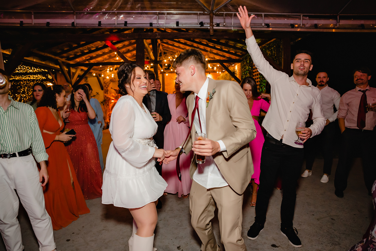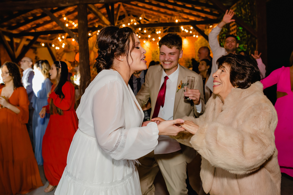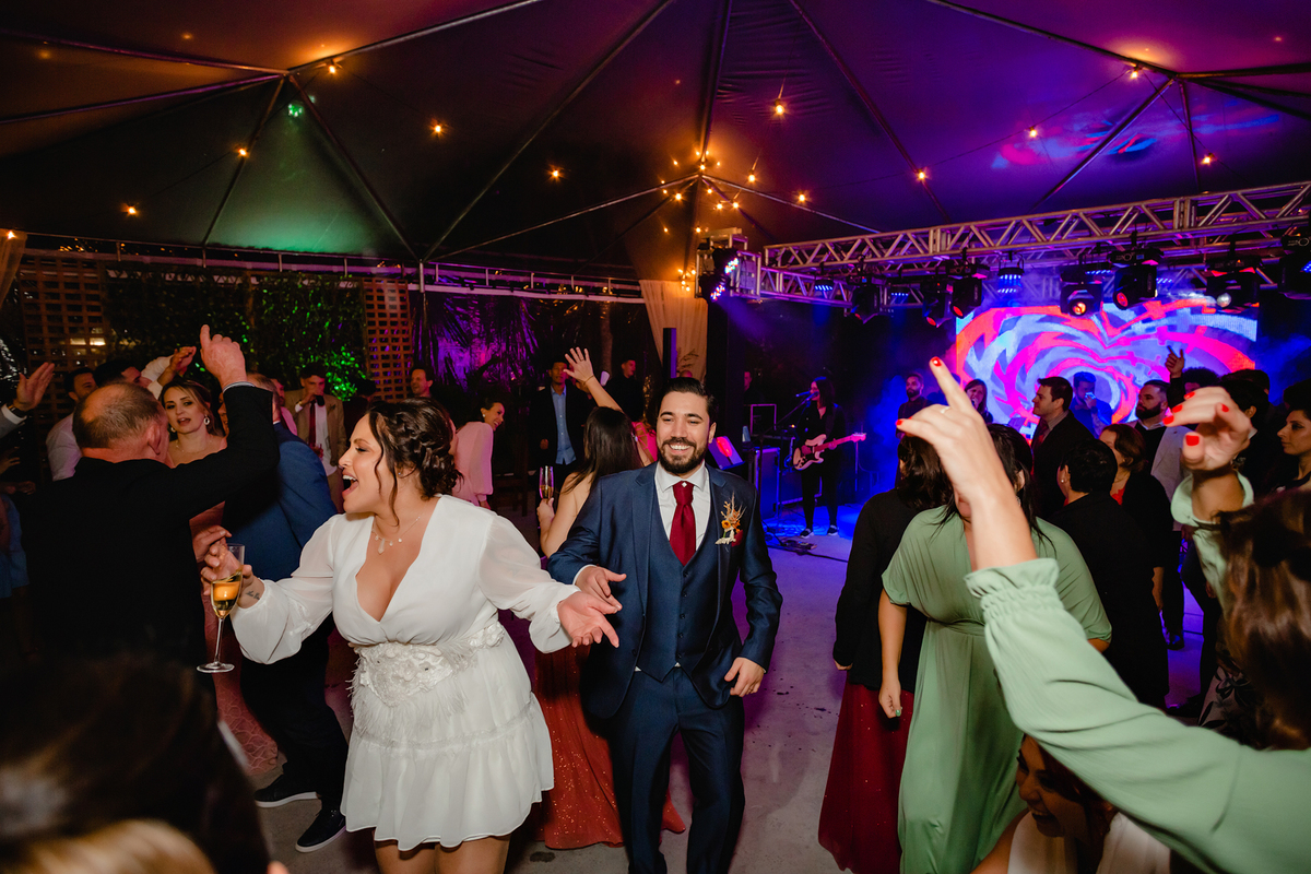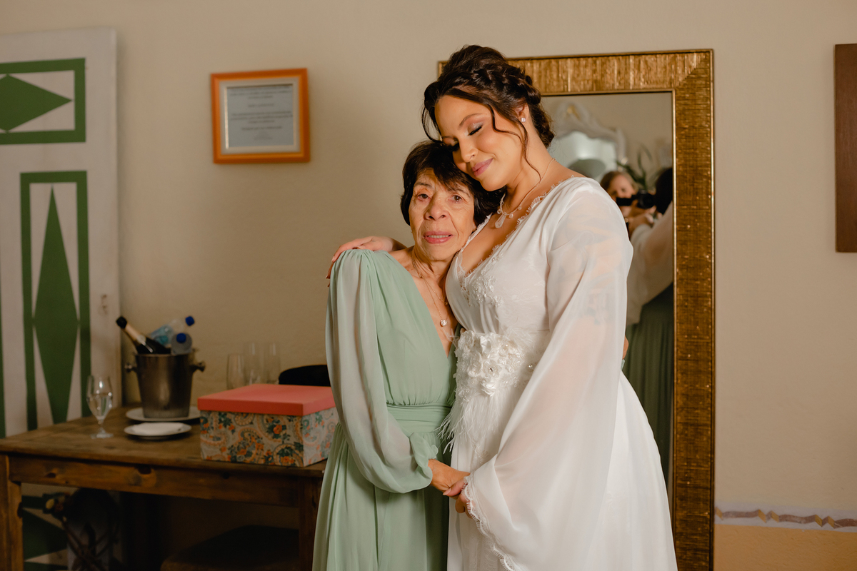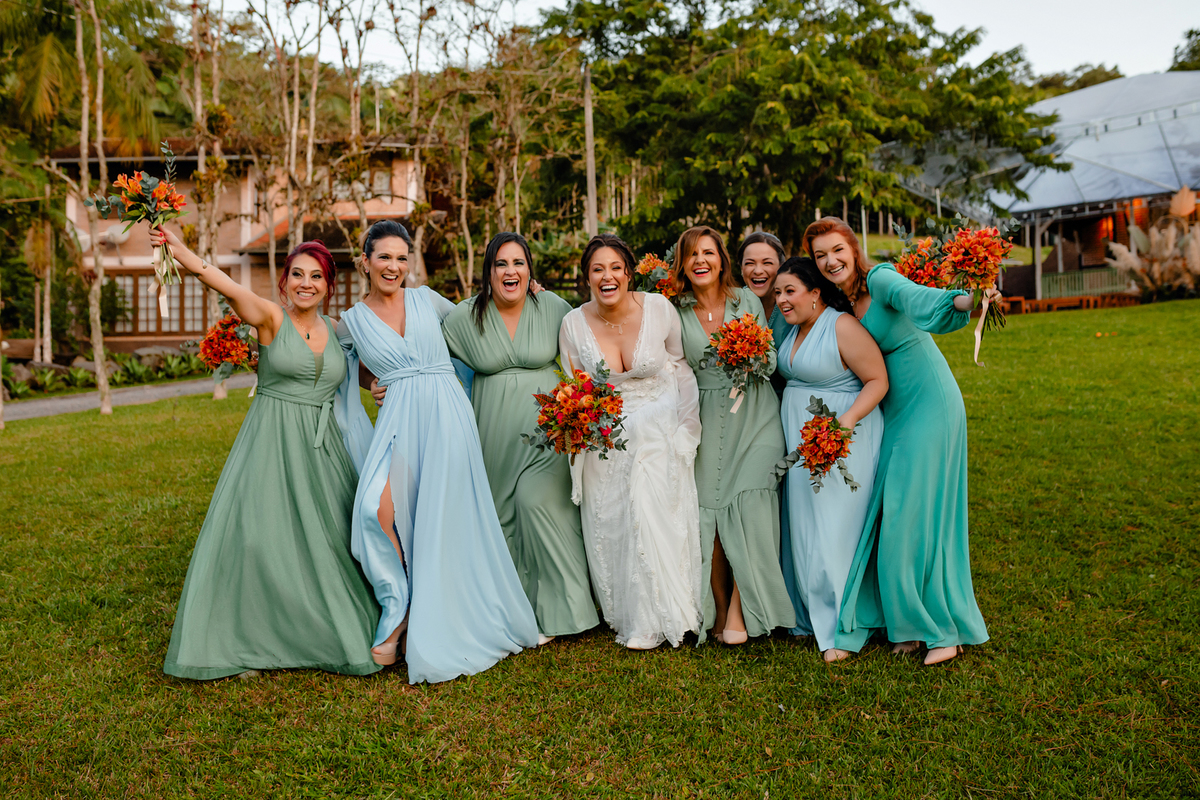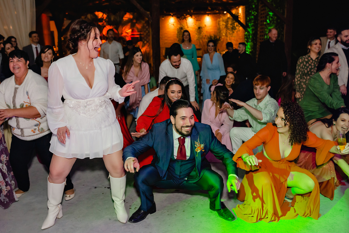 Vamos falar da noiva Gabi, uma alma leve e que contagia a todos com seu sorriso fácil e o brilho nos olhos. Ela fez o seu próprio vestido de noiva, costurou, bordou, ajustou e como ela mesmo falou, a costura não tá muito boa mas é cheio de significado. E não para por aí, a mãe da Gabi já faleceu e no dia do seu casamento a Gabi usou o colar e os brincos que um dia foram dela. E para finalizar, ela nos contou que sempre quis ter o sobrenome Rosa por achar um nome artístico e logo ela conheceu o Gabriel, e seu sobrenome? Rosa. Como uma homenagem e surpresa para o Gabriel, ela tatuou uma rosa com a data do casamento deles e revelou para ele na cerimônia. Lindo, né? Ah, e ainda em vida sua mãe tinha um grupo de amigas, as Lulus e lá estavam elas, como damas de honra.