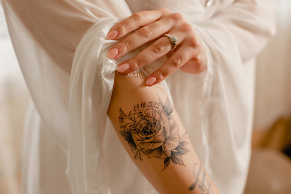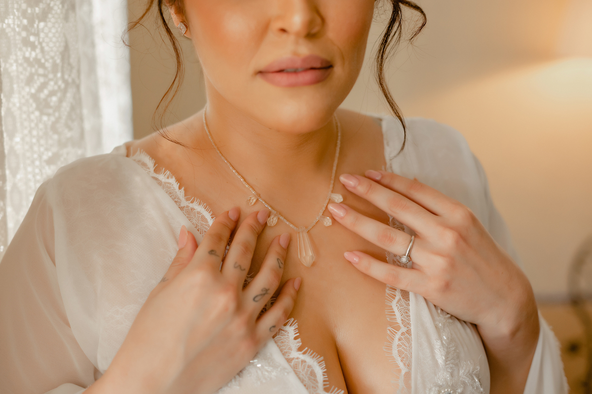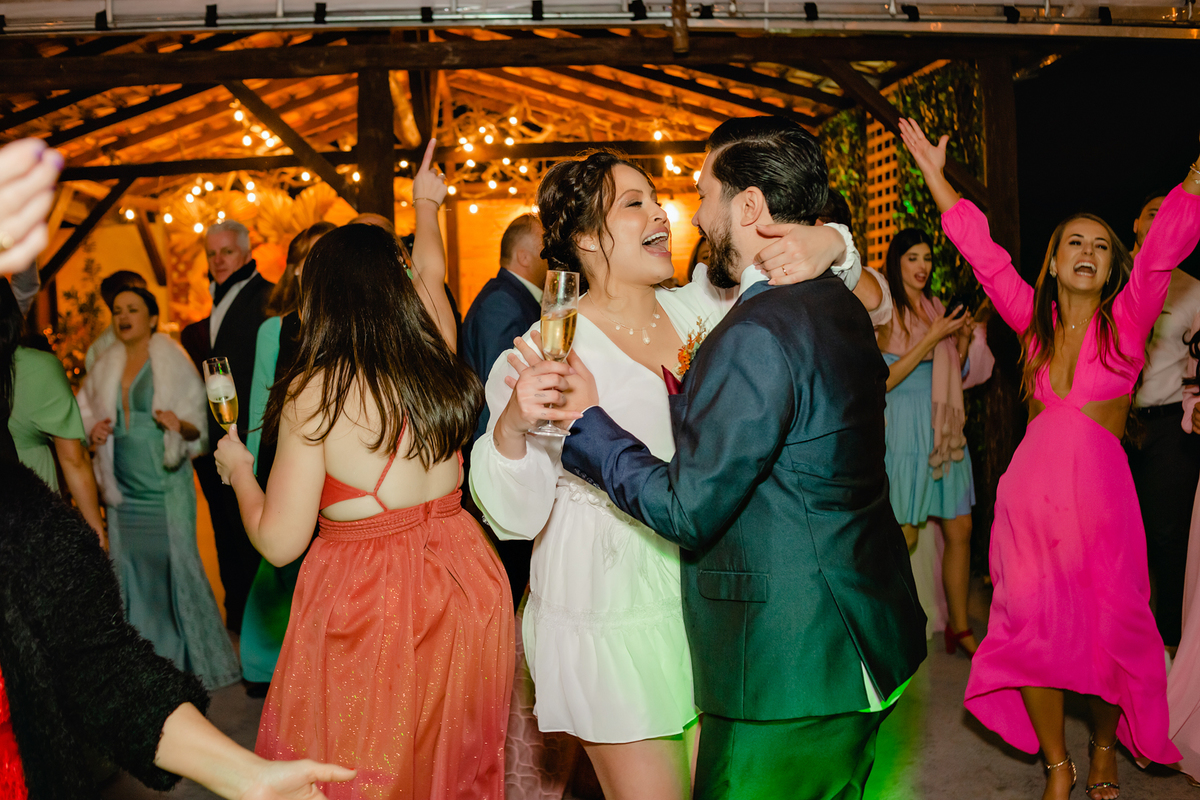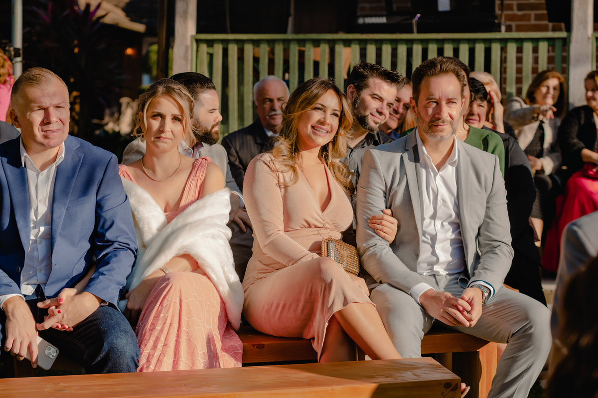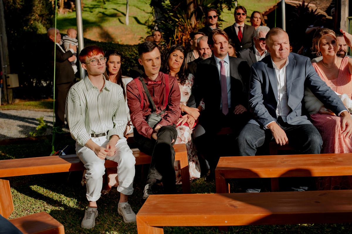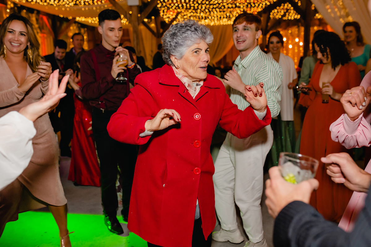 Vamos falar da noiva Gabi, uma alma leve e que contagia a todos com seu sorriso fácil e o brilho nos olhos. Ela fez o seu próprio vestido de noiva, costurou, bordou, ajustou e como ela mesmo falou, a costura não tá muito boa mas é cheio de significado. E não para por aí, a mãe da Gabi já faleceu e no dia do seu casamento a Gabi usou o colar e os brincos que um dia foram dela. E para finalizar, ela nos contou que sempre quis ter o sobrenome Rosa por achar um nome artístico e logo ela conheceu o Gabriel, e seu sobrenome? Rosa. Como uma homenagem e surpresa para o Gabriel, ela tatuou uma rosa com a data do casamento deles e revelou para ele na cerimônia. Lindo, né? Ah, e ainda em vida sua mãe tinha um grupo de amigas, as Lulus e lá estavam elas, como damas de honra.