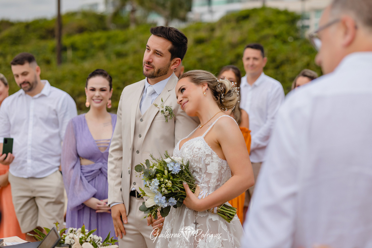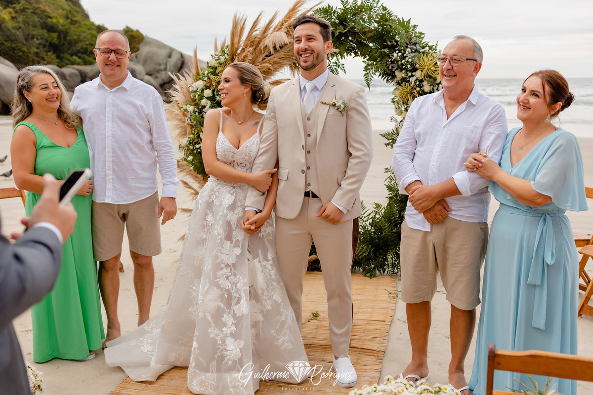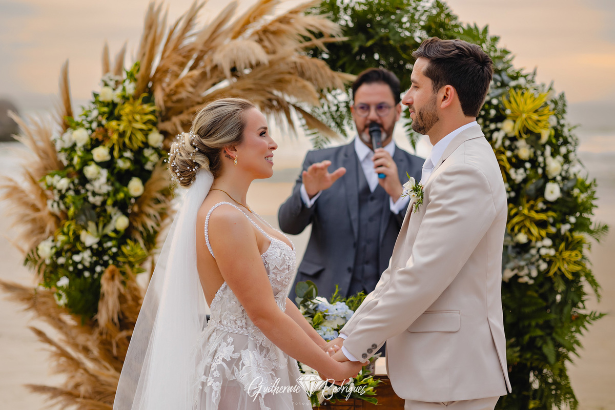 Eles reuniram a família e os amigos mais próximos para uma linda celebração pé na areia na praia de Bombas, na Pousada Pequeno Paraíso. A previsão era de chuva, mas Deus os presenteou com um sol entre nuvens, um amanhecer perfeito.
