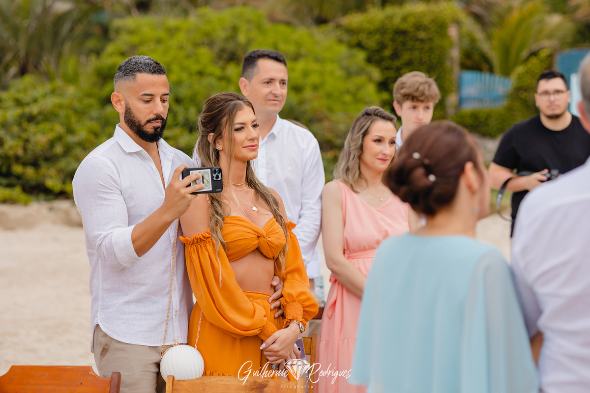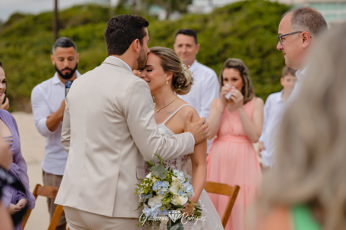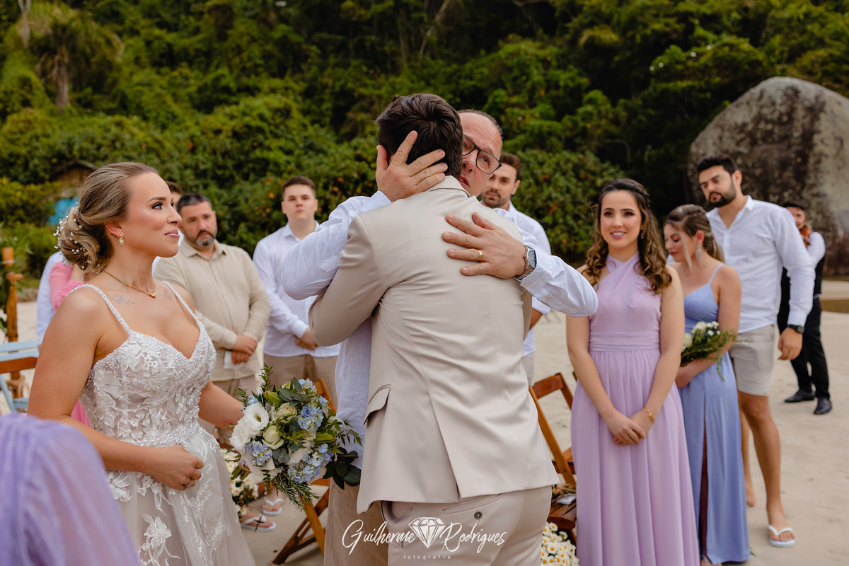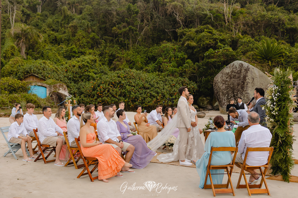 Eles reuniram a família e os amigos mais próximos para uma linda celebração pé na areia na praia de Bombas, na Pousada Pequeno Paraíso. A previsão era de chuva, mas Deus os presenteou com um sol entre nuvens, um amanhecer perfeito.
