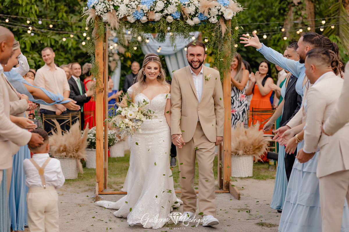 A Jéssica e o Clener se casaram no Espaço Sonho Meu em Itapema, um local com a cerimônia ao ar livre, em meio ao verde e com a recepção em um salão impecavelmente decorado pela P&P Decorações.